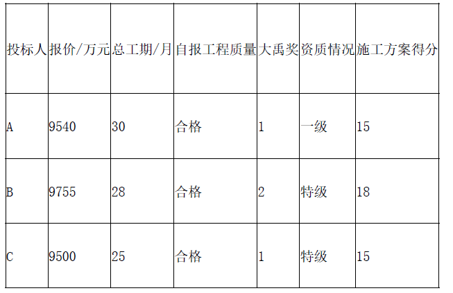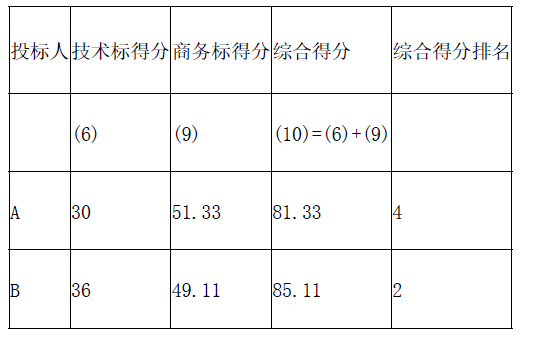 (3)计算各投标人的综合得分,见下表。