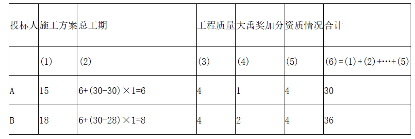 事件1:技术标共40分,其中施工方案20分、施工总工期10分、工程质量6分,资质情况4分。满足招标人总工期要求(30个月)者得6分,每提前1个月加1分,加满至10分为止;自报工程质量合格者得4分,近三年内获大禹奖每项加1分。