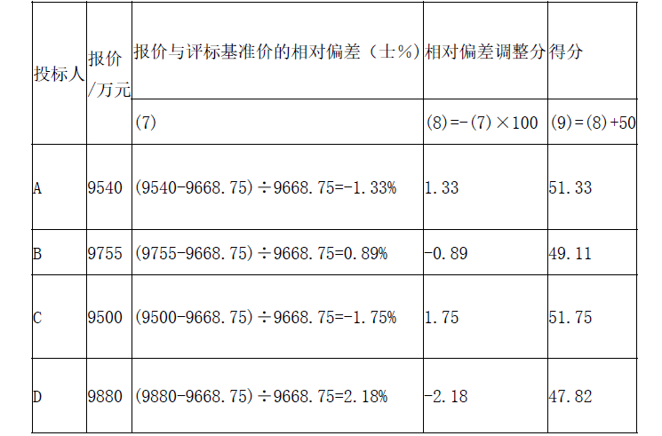 评标基准价=(9540+9755+9500+9880)÷4=9668.75(万元)