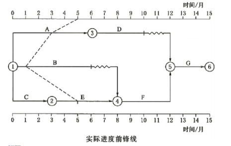 【问题】1.事件1中,根据第5月末的检查结果,在施工进度计划图上绘制实际进度前锋线。
