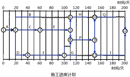某水利枢纽工程由大坝、溢洪道、电站及灌溉引水洞等建筑物组成,发包人通过招标与承包人甲按照《水利水电工程标准施工招标文件(2009年版)》签订了土建工程施工合同,包括A~I共9项工作,合同工期200天;与承包人乙签订了闸门设备制造安装合同,包括P、Q共2项工作,合同工期70天。经甲乙双方协调,并经项目监理机构批准的施工进度计划见下图,各项工作均按最早开始时间安排且匀速施工。
