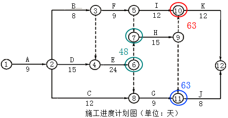 1.针对上图所示的施工进度计划,确定该施工进度计划的工期和关键工作。并分别计箅工作C、工作D、工作F的总时差和自由时差。