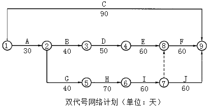 1.工作C、工作J逻辑关系错误。 C的紧前工作是A,图中显示C无紧前工作;J的紧前工作是E、I,图中显示J的紧前工作只有I。 计算工期为260天。关键工作为:A、G、H、I、F、J。 2.根据时标网络计划,堤基清理计划第30~70天完成,共40天,工程量为15000+15000=30000(m3) 计划施工强度为:30000/40=750(m3/天)。 目前的资源配置500m3/天<750m3/天,不能满足计划施工强度要求。 G工作:375m3×40=15000m3 B工作:125m3×40天+500m3×20天=15000m3 资源配置满足计划施工强度要求。 3.第60天实际进度比计划进度拖后,拖后工程量23500-19500=4000,拖后事件60-45=15(天)。 按照目前的施工速度,工期要比原计划拖延。 原堤加高培厚:10000/50=200(m3/天),新建堤身填筑:14000/70=200(m3/天),原计划为200m3/天。 第60天尚剩余工程量24000-19500=4500(m3)。按原施工速度尚需4500/200=22.5(天),而距离工程原计划完成时间第70天需要10天。因此该工作若按原施工速度施工,工期延误12.5天。因H工作为关键工作,工期将拖延12.5天。