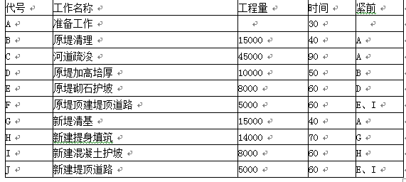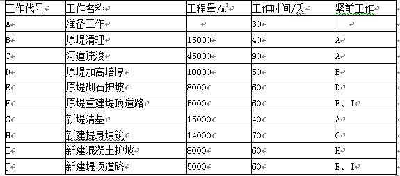某河道治理工程,主要建设内容包括河道疏浚、原堤加高、新堤建设,发包人和承包人按照《水利水电工程标准施工招标文件(2009年版)》签订了施工承包合同。合同约定9个月(每月均按30天计算)。2019年5月1日开工。工作明细表如下。