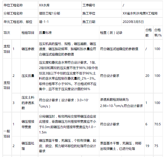 事件2:防护堤填筑时,某一单元工程施工日期是2020年3月1日至2020年3月2日,评定表填写日期是2020年3月5日。验收合格的标准是:①主控项目,检验结果应全部符合本标准的要求;②一般项目,逐项应有70%及以上的检验点合格,且不合格点不应集中;③各项报验资料应符合相关标准要求。土料压实工序施工质量验收评定表见下页表。