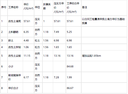 事件1:为增强渠道的稳定性,对工程量清单“换土填方”子项改为4%水泥掺量改性土(简称改性土)换填。换土填方变为改性土后其土料挖装运、铺料、碾压工艺差别不大,但需新增改性土拌制,改性土运输等工序。