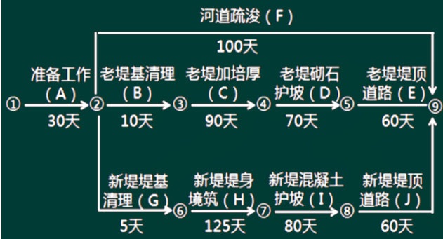 1.指出该工程施工进度计划的关键工作和计算工期。 答:关键工作为:A、G、H、I、J;计算工期为300天。 2.事件1中,完整的开工报审表的附属资料的主要内容包括哪些 开工报审表应详细说明按合同进度计划正常施工所需的施工道路、临时设施、材料设备、施工人员等施工组织措施的落实情况以及工程的进度安排。开工报审表附属资料内容包括: ①开工申请报告(由项目负责人签署、盖章〉。②开工条件说明:施工临时设施基本完成,满足首批开工项目要求;施工组织设计已批准;施工测量放样成果已批准;首批开工项目的施工方案和措施计划已批准;首批开工项目的专项试验成果已批准。③其他:为不影响后续工程施工,目前需发包人着手解决的问题;承包人或监理人认为应提交的书面材料。 3.事件2中,监理人应批准延长工期多少天说明理由。 答:监理人不批准承包人工期延长30天的请求。理由:B工作不在关键线路上,且B工作总时差为40天,B工作延误30天没有超过其总时差。 4.事件3中,截至2019年3月30日,C工作计划完成工程量多少天实际完成工程量多少天分析对工期的影响。 答:从2018年12月1日至2019年3月30日,共120天。 工作C计划完成的工程量=120-(30+10) =80(天) 工作C实际完成的工程量=90x 50%=45(天) 截至2019年3月30日,工作C进度累计延误=80-45=35(天) 由于工作B延误30天,工作C的实际延误变为5天,而工作C还剩余总时差10天,所以对总工期没有影响。
