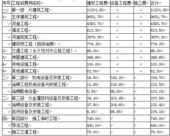 建筑工程=河道工程+清淤工程+河道拓宽工程+自排涵闸+永久性对外公路工程+房屋建筑工程+供电设施工程+其他建筑工程=4393.70+613.50+3870.30+774.25+98.00+289.85 +100.00+62.00=10201.60(万元)