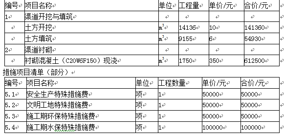 分类分项工程量清单(部分)