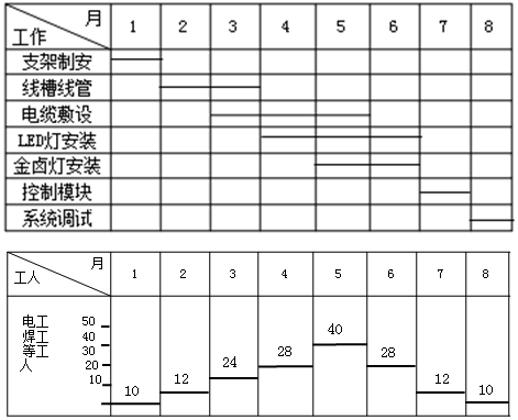 某项目部分工作横道图和对应的劳动力计划图如下图所示,图中LED灯安装需要的工人数为()。