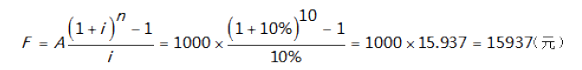 (已知A求F)某投资人拟在10年内,每年末存1000元,年利率10%。 【问题】 问10年末本利和为多少