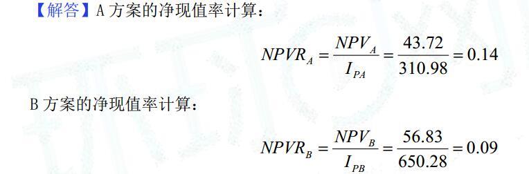计算结果表明,如果根据净现值的大小来选择项目的投资建设方案,由于 NPVA =43.72 万元<NPVB=56.83 万元,应该选择 B 方案;如果根据净现值率的大小来选择,由于 NPVRA=0.14>NPVRB=0.09,应该选择 A 方案。