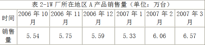 W厂生产A产品。鉴于目前的市场态势,该厂拟调整2007年二季度的生产计划。为此,委托Y咨询公司对该厂所在地区的A产品的销售量进行预测。Y公司根据本公司目前仅有的行业统计信息库,统计了W厂所在地区2006年10月-2007年3月的A产品销售量,见表2-1。