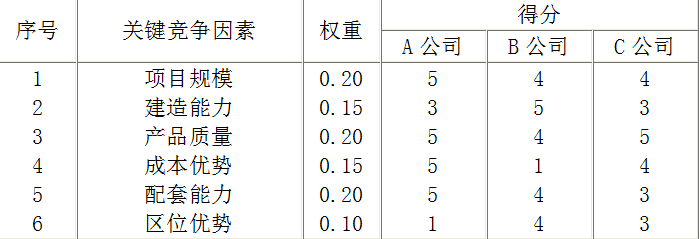 房地产企业A在某城市主要经营高端住宅项目,该城市高端住宅市场竞争激烈,A地产企业与主要的竞争对手B、C的竞争态势矩阵如表5-17所示。