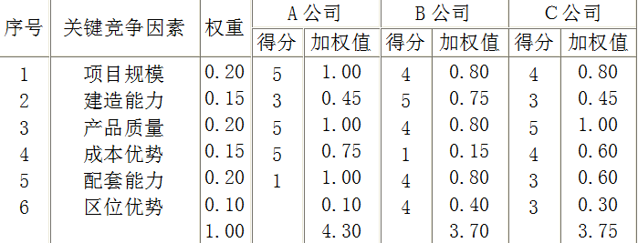 从计算结果来看,A公司的加权强势得分为4.3分,B公司的加权强势得分为3.7分,C公司的加权强势得分为3.75分,因此可以看出,A公司的竞争实力要明显强于B、C公司。