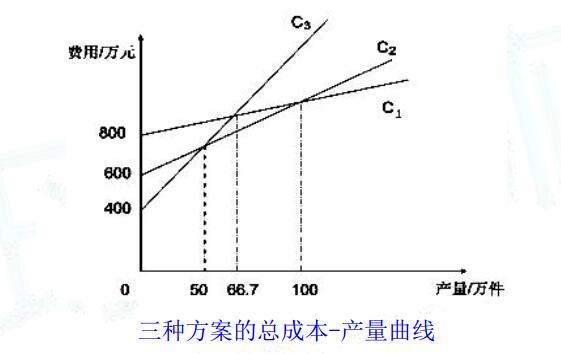 (2)800+10Q=600+12Q 得出 Q=100;800+10Q=400+16Q 得出 Q=400/6=66.7;600+12Q=400+16Q 得出Q=50。所以产能≤50 万件时,三个投资方案的优劣排序为:方案 3、方案 2、方案 1;50 万件≤产能≤66.7 万件时,三个投资方案的优劣排序为:方案 2、方案 3、方案 1;66.7 万件≤产能≤100 万件时,三个投资方案的优劣排序为:方案 2、方案 1、方案 3;方案 1;产能≥100 万件时,三个投资方案的优劣排序为:方案 1、方案 2、方案 3。