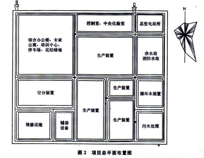 (2012年真题)西北某黄河沿岸城市拟新建一工业项目。项目业主委托甲咨询单位进行项目的可行性研究。甲咨询单位在项目论证中提出了项目总平面布置图,如图4-1所示。图中项目总占地面积45公顷;建(构)筑物、堆场占地面积16公顷,其中,行政办公及生活服务设施用地面积3.6公顷;绿化用地面积8.35公顷