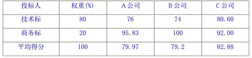 (2)商务标评审:A、B、C 三家咨询公司的投标报价中,B 公司最低,计为 100 分;A公司商务标按“反比例递减法”得分:(115÷120)×100=95.83;C 公司商务标按“反比例递减法”得分:(115÷125)×100=92.00