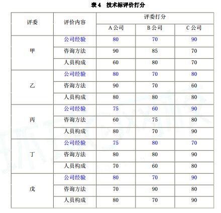 (2004年真题)某业主拟招标选择一家工程咨询公司来编制某项目的可行性研究报告,资格预审后有三家符合标准条件的工程咨询公司参加了投标。本次评标,技术标的权重为80%,商务标的权重为20%。技术标对工程咨询公司的经验、本项目拟采用的咨询方法和项目组人员构成三个分项进行评审,分项权重分别为20%、30%和50%。评标委员会由5人组成,评委们对三家咨询公司的技术标评分结果如表4所示。三家咨询公司的投标报价分别为:A公司120万元,B公司115万元,C公司125万元。