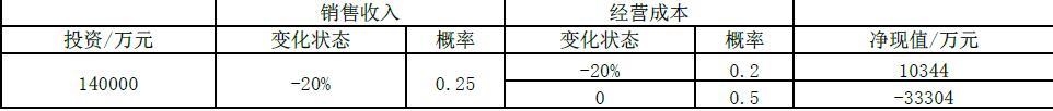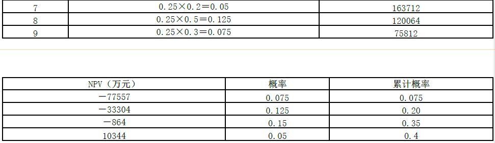 由上表,净现值小于0的概率为0.35;则大于等于0的概率为65%。因此,项目的财务抗风险能力较强。