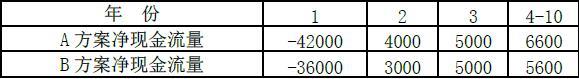 A方案的财务净现值 =-42000×(P/F,6%,1)+4000×(P/F,6%,2) +5000×(P/F,6%,3)+6600×(P/A,6%,7)×(P/F,6%,3) =-929.86万元。 B方案的财务净现值 =-36000×(P/F,6%,1)+3000×(P/F,6%,2) +5000×(P/F,6%,3)+5600×(P/A,6%,7)×(P/F,6%,3) =-846.56万元。 因此,两个方案在财务上都不可行。