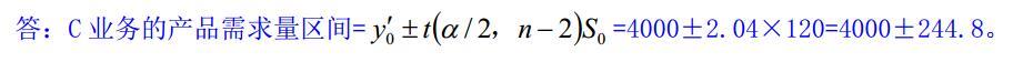 (2016年真题)甲公司经营A、B、C三项不同业务,为改进业务发展策略,甲公司委托乙咨询公司对其各项业务进行分析。 在对C业务进行产品市场预测时,某咨询工程师预测2016年C业务产品市场需求为4000万件,其中检验系数t(a/2,n-2)=2.04,S0=120(a=0.025,n=30)。 【问题】根据市场预测结果,分析2016年C业务的产品需求量区间。