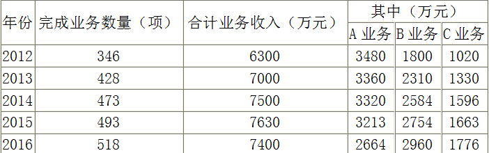 1.五年来,企业的业务数量和业务收入整体为增长趋势。其中A业务的收入却为连续下降趋势,总体下降比例约为23.4%;B业务和C业务收入稳步增长,各自的增长率约为64.4%和75.9%,资本倾向B、C业务。