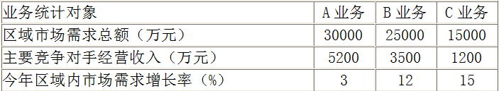 (2)2016年业务区域内A、B、C业务市场需求及主要竞争对手的经营数据见下表。