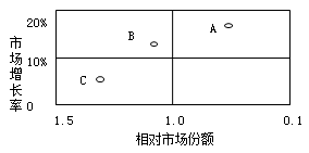 (2008年真题)某公司有A、B、C三项业务,分别提供不同的产品和服务。为寻求企业资源的最佳组合,该公司采用波士顿矩阵对上述三项业务进行了分析,结果如下图所示。
