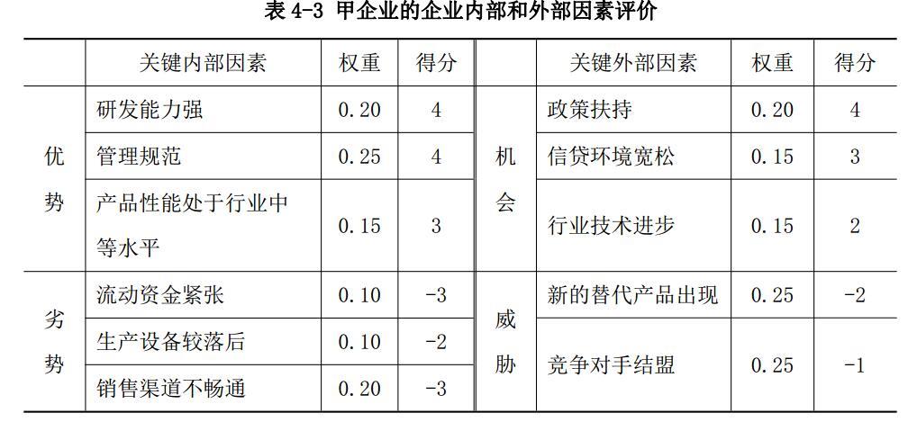 (2)甲企业应采取增长性战略。 理由: 根据 SWOT 分析, 甲企业内部因素评分为 1.15, 有内部优势;外部因素评分为 0.8, 面临一定外部机遇, 所以应增加投资、 扩大生产, 提高市场占有率