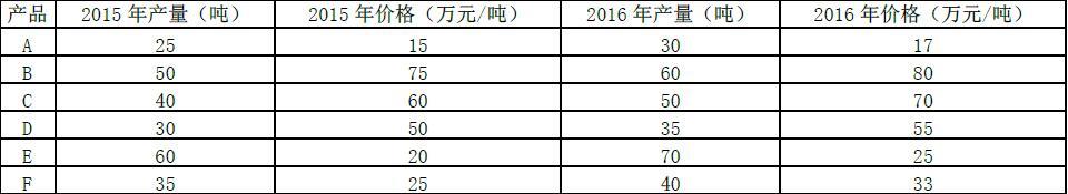 某经济体生产6种产品,它们在2015年和2016年的产量和价格见下表。