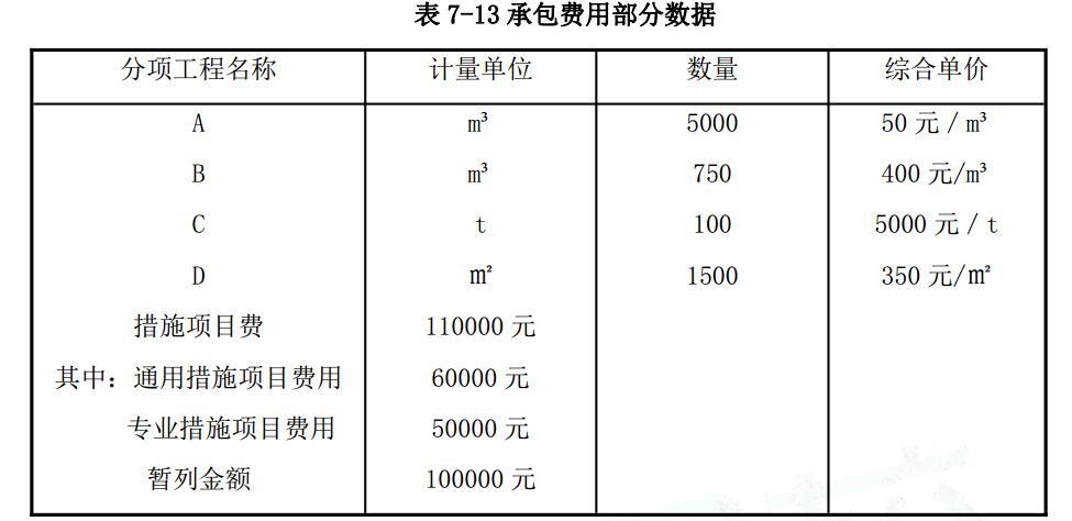 某工程项目由A、B、C、D四个分项工程组成,采用工程量清单招标确定中标人,合同工期5个月。承包人费用部分数据见表7-13。