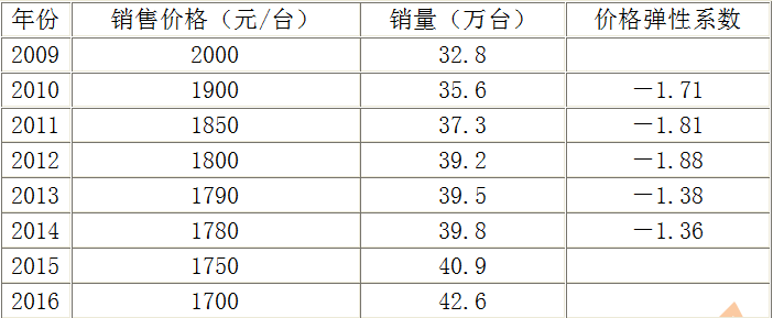 2.如果甲企业决定在2017年将该品牌家电产品价格降至1650元/台,基于表3-1给出的2009年以来的数据,用价格弹性系数法预测2017年A地区该品牌家电产品的销量。