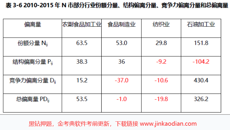 【问题】1.【解答】恰当。理由:偏离-份额分析法是分析区域经济和产业结构的常用方法。偏离-份额分析法可以用来评价区域经济结构和竞争力,找出区域具有相对竞争优势的产业部门,确定区域未来产业结构调整的方向。该研究机构采用偏离-份额分析法可以对N 市主要制造业的竞争力情况进行分析。
