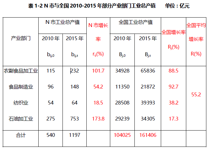 N市近年来出台了许多政策推动制造业转型升级,现委托一家咨询研究机构对产业结构调整效果和产业竞争力情况进行研究。经过调研,该咨询研究机构得到N市与全国2010-2015年部分产业部门工业总产值数据(见表1-2)。该咨询研究机构希望采用偏离-份额分析法对2010-2015年主要制造业情况进行分析。