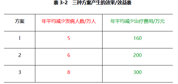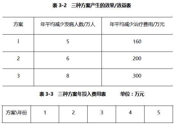 某地区流感发病率逐日上升,为此当地政府制定了三种疫苗接种方案,计算期均设为5年。根据咨询人员分析论证,项目效果表现为减少发病人数,同时也节省了治疗费用,数据见表3-2;各