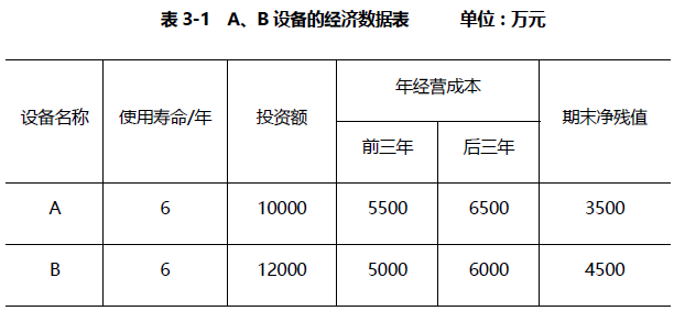 某流感疫苗生产商的车间设备因寿命期已到需要更新,有A、B两种新设备可供选择,产生的效益相同。两种设备的经济数据见表3-1,设备投资发生在年初。财务基准收益率取15%。