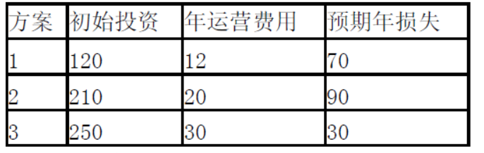 国家提出要建设一个针对某一特定灾害的防灾预警系统,用来减少灾害损失。现在有3个互斥建设方案,收益期均为20年。根据统计资料分析及专家论证,如果不建造该预警系统,预期未来每年灾害经济损失为120亿元;若建造该防灾预警系统,除初始投资外,每年还需要支付系统维护费用,但可降低每年预期灾害损失。各方案的初始投资、每年运营维护费用及预期年损失等资料见下表。设定基准收益率为8%。