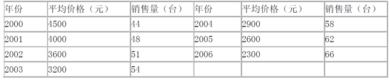 某家电生产企业聘请一家咨询单位对其产品及市场进行预测评估。(1)对其空调主要销售地区进行了市场调查,2000~2006年空调销售量和平均价格见下表,预计到2007年空调价格下降到2000元,现需要预测该地区2007年的空调销售量。表2000~2006年空调销售量和平均价格表