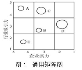 其中 A 代表计算机,B 代表洗衣机,C 代表手机、D 代表空调,E 代表冰箱。由上图可知,该企业计算机的企业实力和行业吸引力均较强,其市场份额为 12.5%;洗衣机的企业实力和行业吸引力均中等,其市场份额为 14.28%;手机的企业实力中等,但具有较强的行业吸引力,其市场份额为 25%;空调的行业吸引力中等,企业实力较弱,但其市场份额为 50%;冰箱的企业实力较强,但行业吸引力较低,其市场份额为 16.67%。据此分析得出,该企业对计算机、手机应采取积极的投资发展战略、择优重点发展战略,扩大生产,增加盈利能力;对洗衣机、冰箱可采取区别对待战略、适当盈利策略;对空调应采取利用或退出战略,迅速获利、收回投资,放弃该业务。