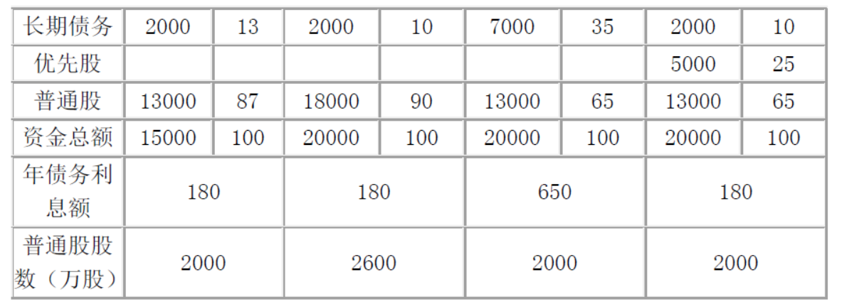 B公司拥有长期资金15000万元,其资金结构为:长期债务,2000万普通股,13000万元先准备追加融资5000万元,有三种融资方案可供选择:增发普通股,增加债务,发行优先股,企业所得税税率为25%,