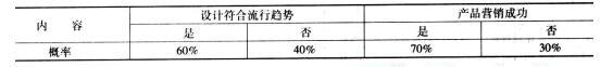 某时装公司拟投资4000万元开发一个时装设计生产项目,项目的成败取决于时装的设计是否符合流行趋势,且营销是否成功。通过采用专家调查法进行分析,认为可能出现四种状态:状态I,设计符合流行趋势,产品营销获得成功,实现预定的销售收入;状态Ⅱ,设计符合流行趋势,但产品营销不成功,只能实现预定销售收入的80%;状态III,设计不符合流行趋势,但成功的营销有效改善了销售效果,可以实现预定销售收入的50%;状态Ⅳ,设计不符合流行趋势,且产品营销失败,只能实现预定销售收入的30%。时装设计符合流行趋势及产品营销成功的概率预测见表5。