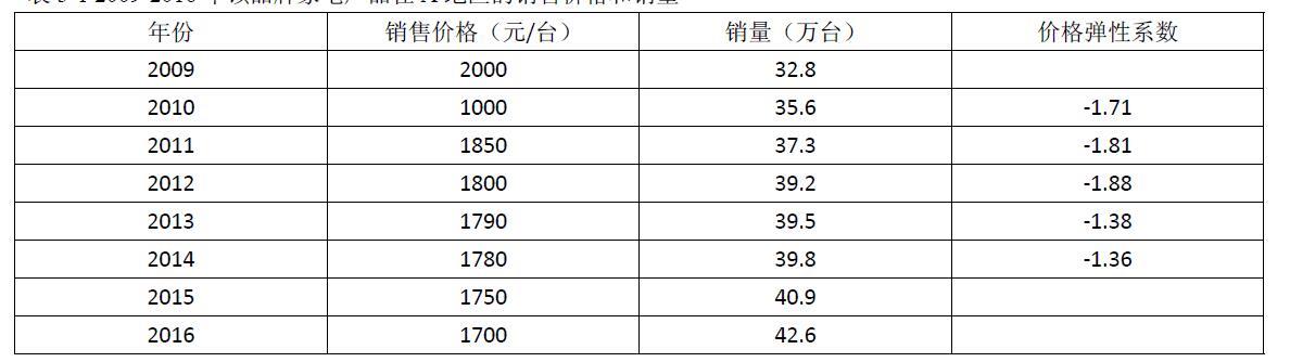 2、如果甲企业决定在2017年将该品牌家电产品价格降至1650元/台,基于表3-1给出的2009年以来的数据,用价格弹性系数法预测2017年A、地区该品牌家电产品的销量。