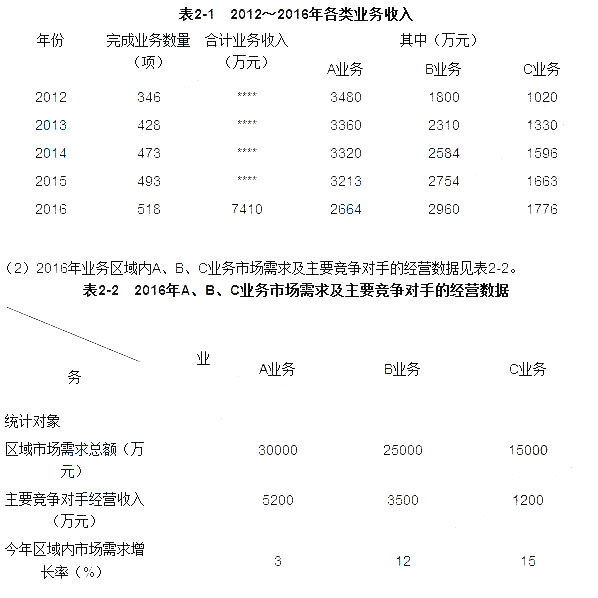 (1)企业收入主要源于A、业务,B、业务和C、业务,各类业务收入情况见表2-1。