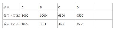项目 C 费用效果比6800/36.7=185.28(元/人),小于200(元/人),符