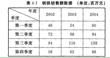 一家咨询公司受某钢铁厂委托,为其所在地区的钢铁消费市场进行分析和预测。为了收集数据,咨询公司分别走访了钢铁工业协会,钢铁研究院和省、市统计局等相关部门,并收集到了该地区2002~2004年的钢铁销售额数据,见表4-1。