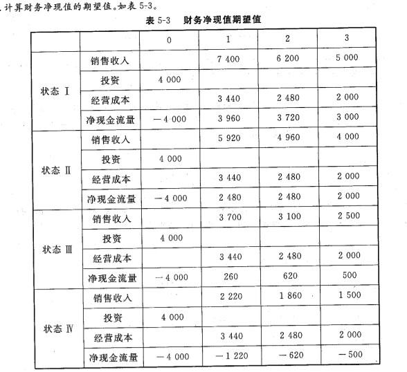 状态III发生的概率是0.4×0.7 = 0.28; 状态IV发生的概率是0. 4 × 0. 3 = 0.12; 财务净现值的期望值是