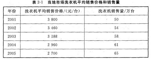 某洗衣机生产企业为应对市场竞争,近年来一直以降低产品销售价格作为主要竞争策略。为了改善经营业绩,该企业拟调整竞争策略,并为此聘请一家咨询公司对当地洗衣机市场进行分析。咨询公司从委托单位得到了部分资料,见表2-1。
