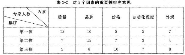 咨询公司用德尔菲法对影响洗衣机销量的主要因素进行了市场调查,从研究部门、家电经销商和知名家电企业选择了36名专家实施调査。在意见征询表中,列出了质量、价格、品牌、外观、噪音、自动化程度和售后服务等项目,要求专家从中选择3个影响销售的主要因素,并按其重要性排序。在第二轮征询后,按专家排序情况和评分标准(排为第一位的给3分,排为第二位的给2分,排为第三位的给1分)评分,排在前5位的为质量、品牌、价格、自动化程度和外观5个因素。第三轮征询后,36名专家对该5个因素的重要性进行排序的人数分布情况,见表2-2。