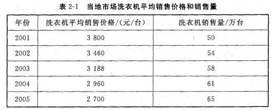 某洗衣机生产企业为应对市场竞争,近年来一直以降低产品销售价格作为主要竞争策略。为了改善经营业绩,该企业拟调整竞争策略,并为此聘请一家咨询公司对当地洗衣机市场进行分析。咨询公司从委托单位得到了部分资料,见表2-1。